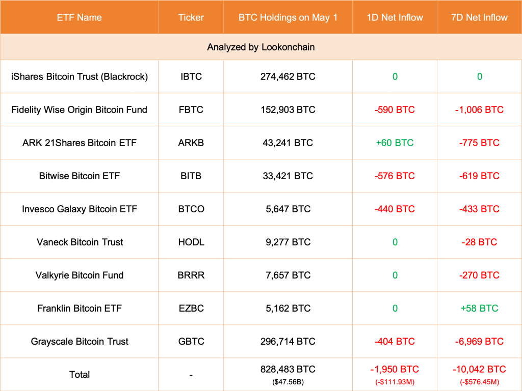 Com base nos dados da Lookonchain, a entrada de Bitcoin nos oito principais ETFs de Bitcoin, incluindo aqueles gerenciados pela BlackRock e Grayscale (GBTC), foi interrompida. Em 1º de maio, todos esses emissores reduziram coletivamente suas participações em aproximadamente 1.950 Bitcoins. Vale ressaltar que o IBIT da BlackRock não registrou nenhuma entrada nos últimos cinco dias consecutivos.