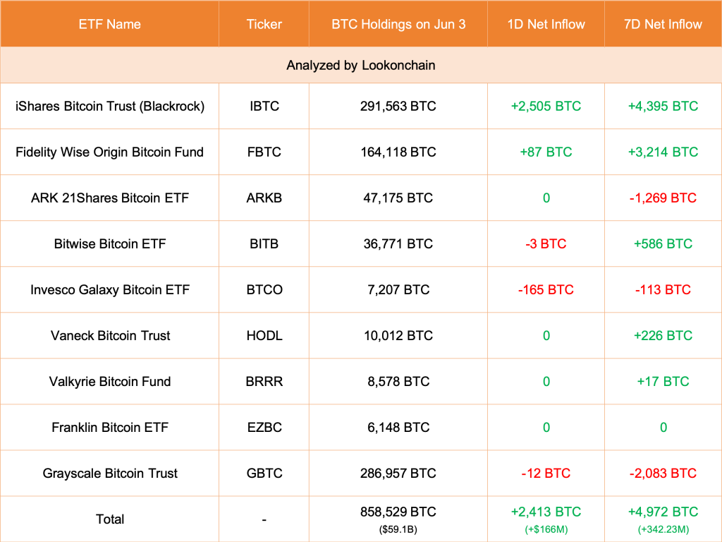 Em 3 de junho, dados da Lookonchain indicaram que os provedores de ETF à vista de Bitcoin com sede nos EUA adquiriram aproximadamente 2.425 Bitcoins. Em contraste, o GBTC da Grayscale viu uma diminuição de apenas cerca de 12 Bitcoins.