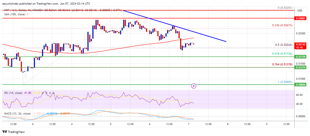 Há uma linha de tendência de baixa se formando com resistência próxima a US$ 0,5250 no gráfico horário do par XRP/USD (fonte de dados da Kraken).