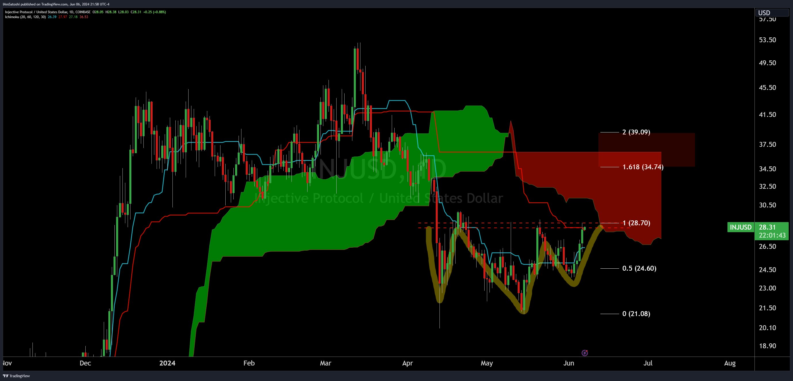 Como investidor em criptografia, acompanho de perto os padrões técnicos do mercado, e um desses padrões que chamou minha atenção recentemente é a formação de cabeça e ombros. Nesta configuração, o decote, que é uma linha significativa de resistência, é traçado através dos picos de ligação entre o ombro esquerdo, o ombro direito e a cabeça. No gráfico de Olszewicz, esta linha está em torno de US$ 28,70. Se o preço ultrapassar este nível, seria considerado um sinal de alta, indicando que o padrão foi concluído e que uma tendência de alta para o INJ está provavelmente no horizonte. De acordo com a análise gráfica que conduzi, o preço do INJ parece prestes a ultrapassar este limite crítico em breve.